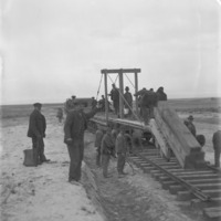 - "Laying the Oregon Short Line, Buhl Extension. 1906.; Men laying a railroad track.
