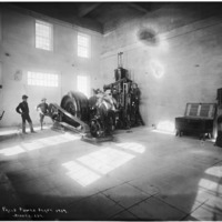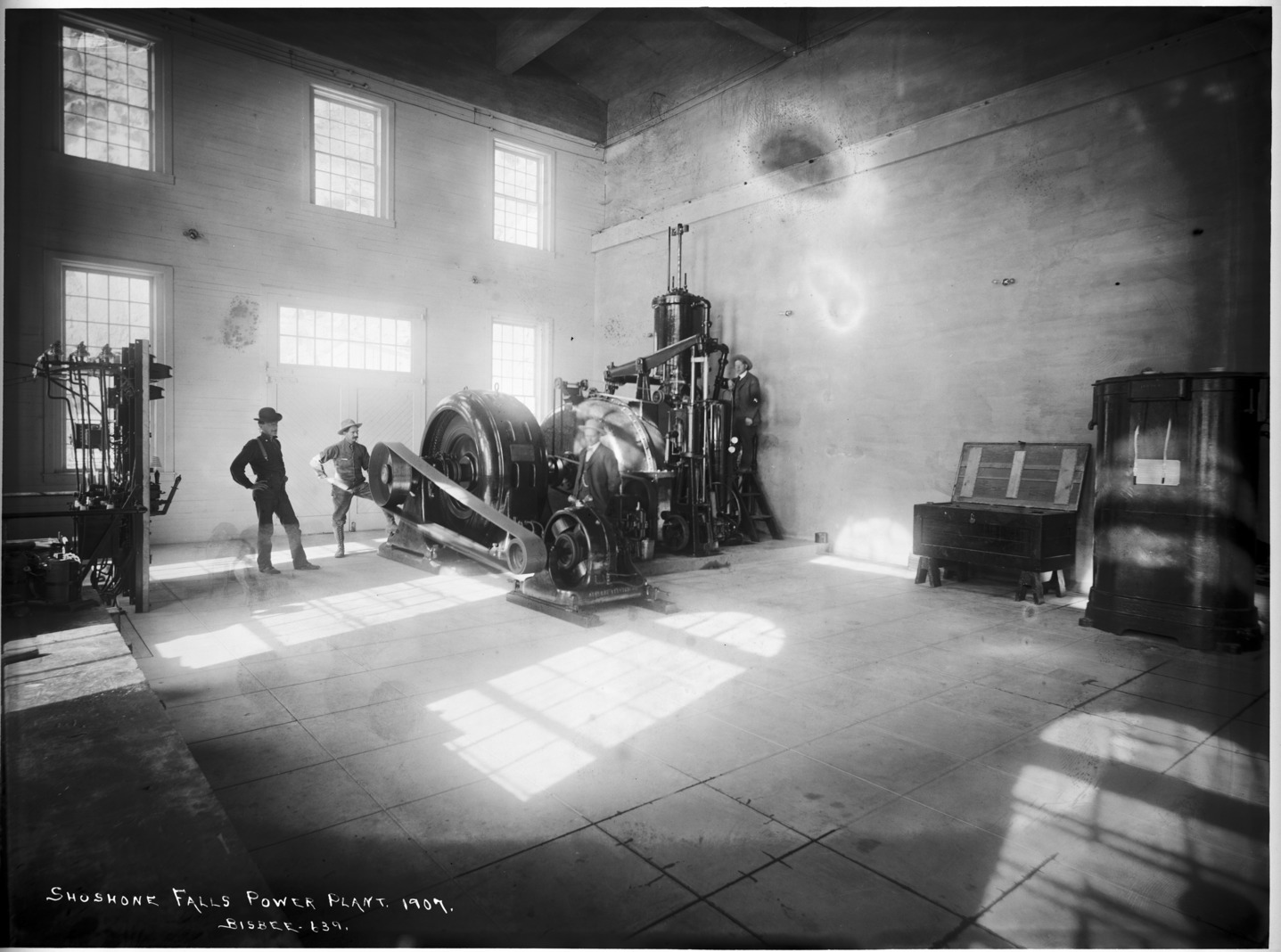 - "Shoshone Falls Power Plant,1907; interior view of the power plant, with men standing near a generator.