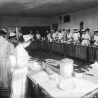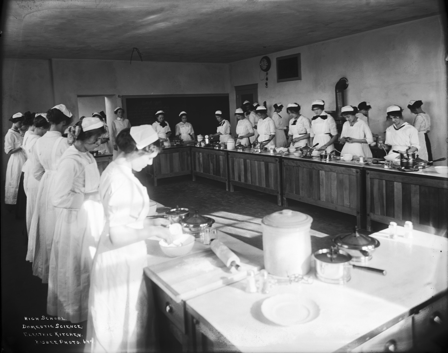 - "High School. Domestic Science. Electric Kitchen;" female students prepare food in a classroom