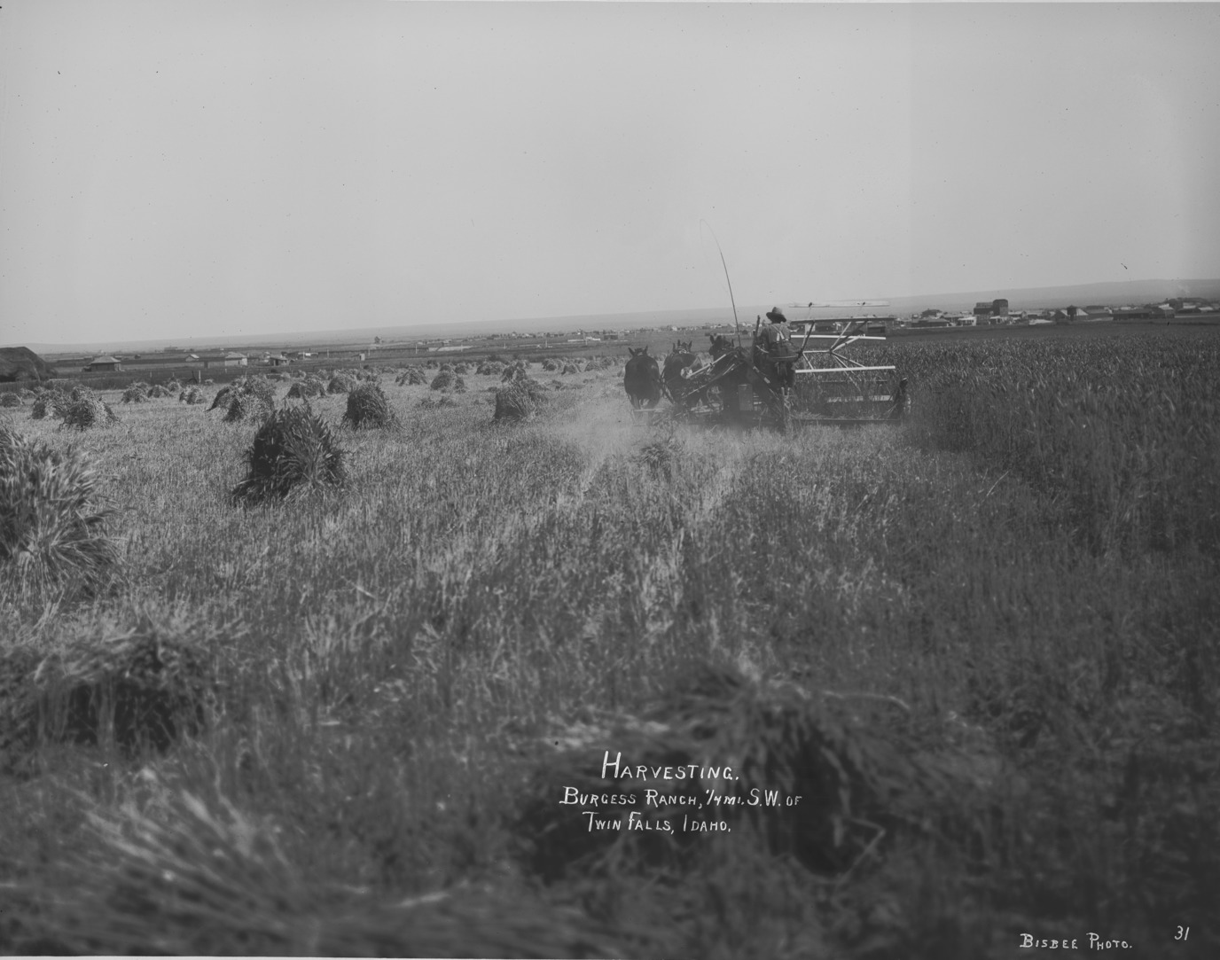- "Harvesting. Burgess Ranch, 1/4 mile Southwest of Twin Falls, Idaho;" Man with a four-horse team, operating a reaper-binder in a grain/wheat field.
