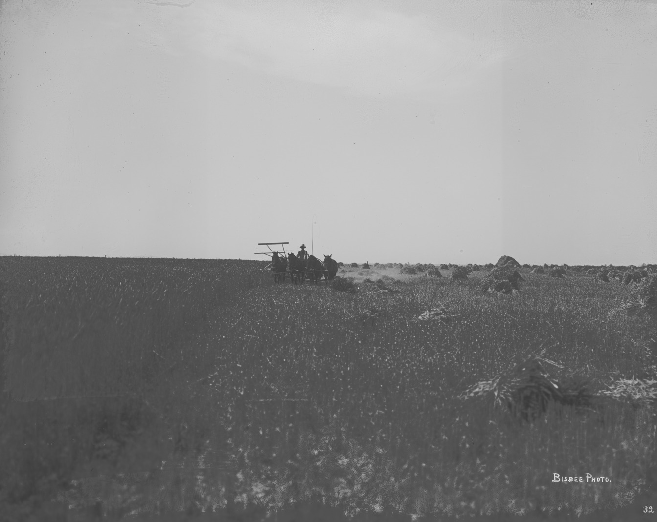 - A man with a four-horse team, operating a reaper-binder, possibly on the Burgess Ranch, 1/4 mile southwest of Twin Falls, Idaho.