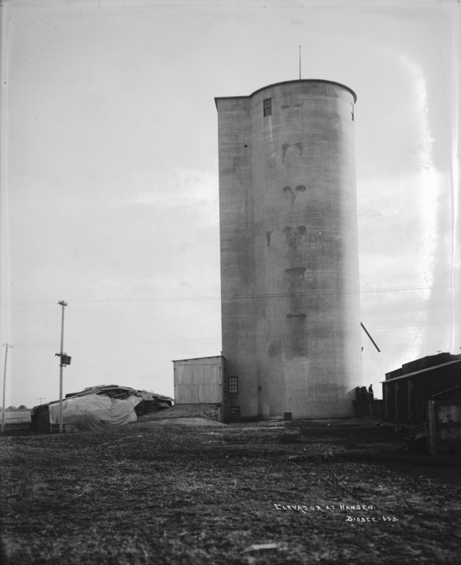 - "Elevator at Hansen;" Elevator at Hansen;" grain elevator in Hansen, Idaho; other outbuildings can be seen