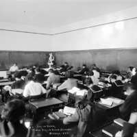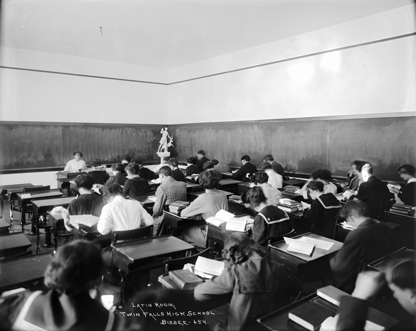 - "Latin Room. Twin Falls High School;" classroom with students at desks, teacher at desk in front of blank chalkboards; statue on pedestal in corner.