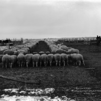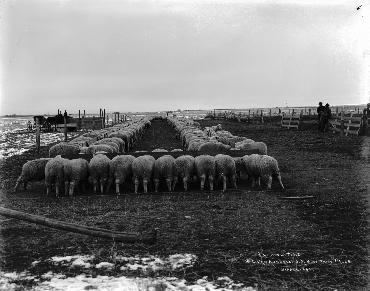 - "Feeding Time. H.C. Van Ausdeln. 3 Miles West of Twin Falls;" men watching sheep as they feed from large troughs. Buggy and horses on right.
