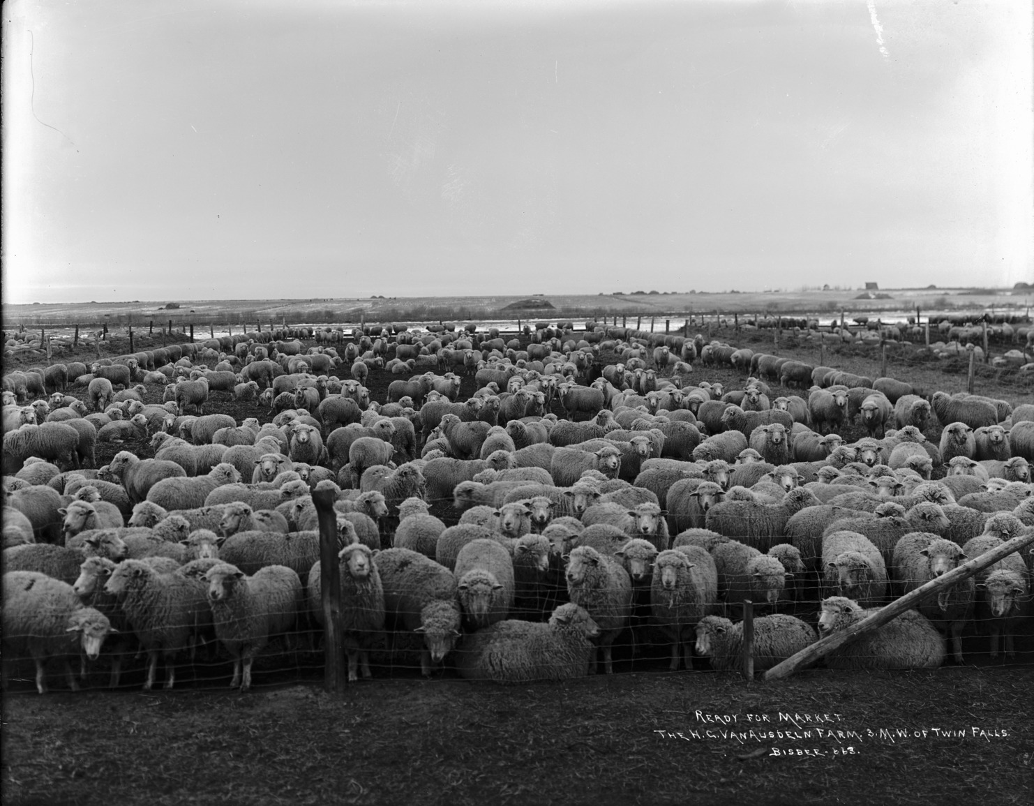 - "Ready For Market. The H.C. Van Ausdeln Farm. 3 Miles West of Twin Falls;" Sheep in pens