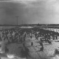 - "3067 Rabbits Were Killed in the Morning Drive. February 11, 1913;" Rabbit drive, with hundreds of rabbits in the foreground being pushed down a lane by a large group of hunters in the background