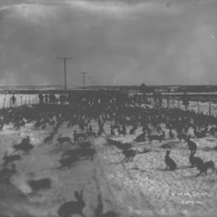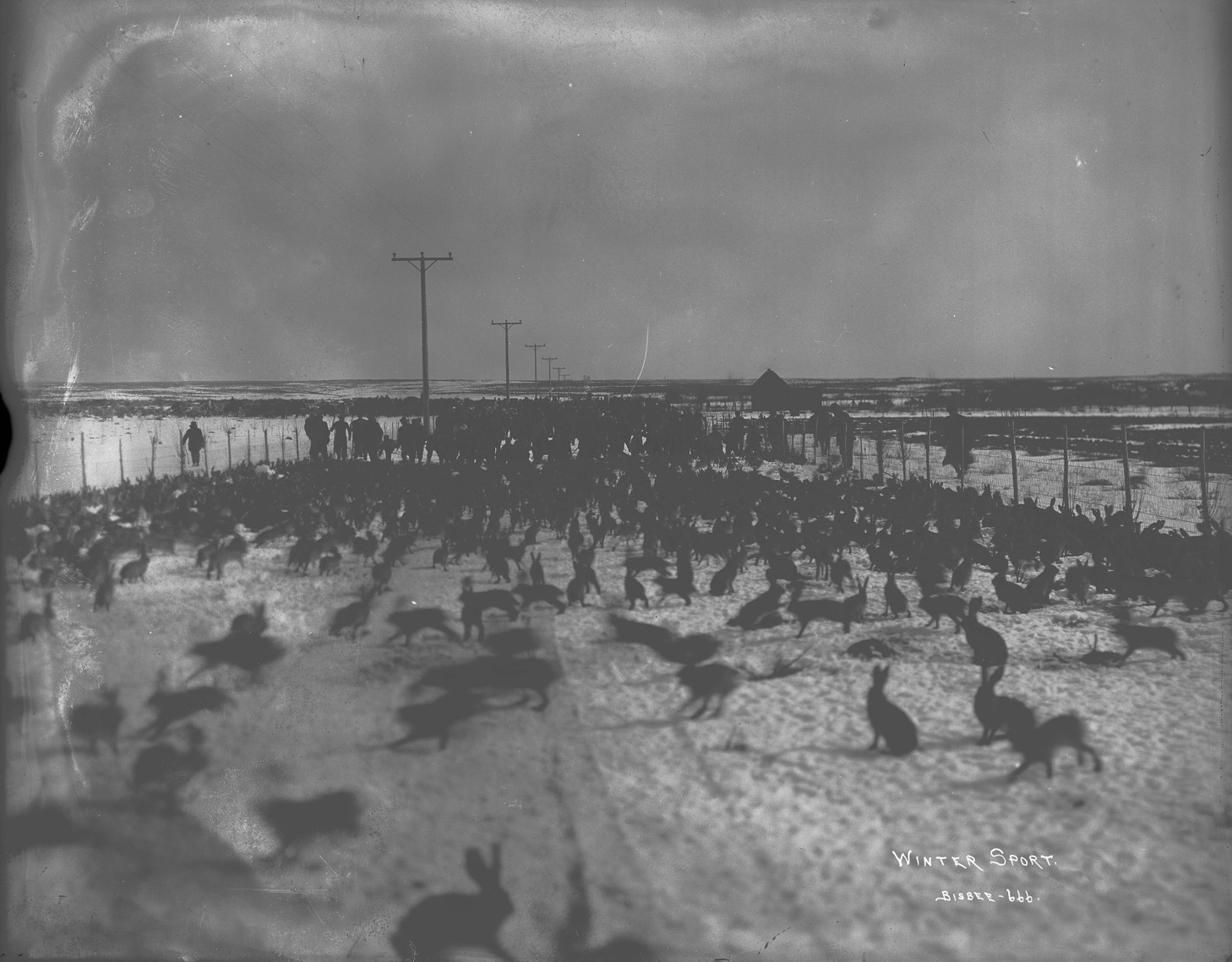 - "Winter Sport;" Rabbit drive, with rabbits in foreground being pushed down a lane by a group of hunters in the background on February 11, 1913