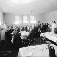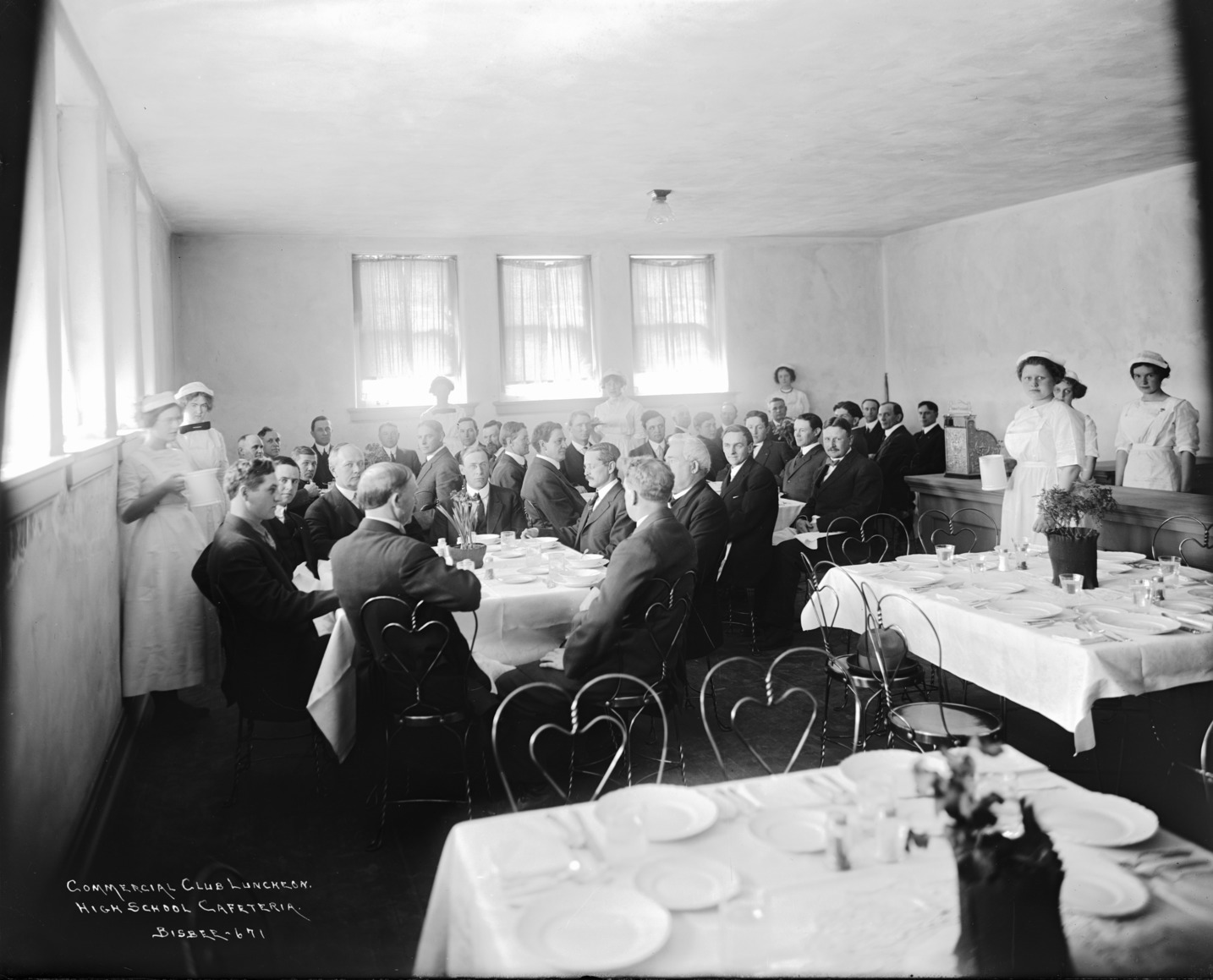 - "Commercial Club Luncheon. High School Cafeteria;" Men being served food by school girls.