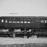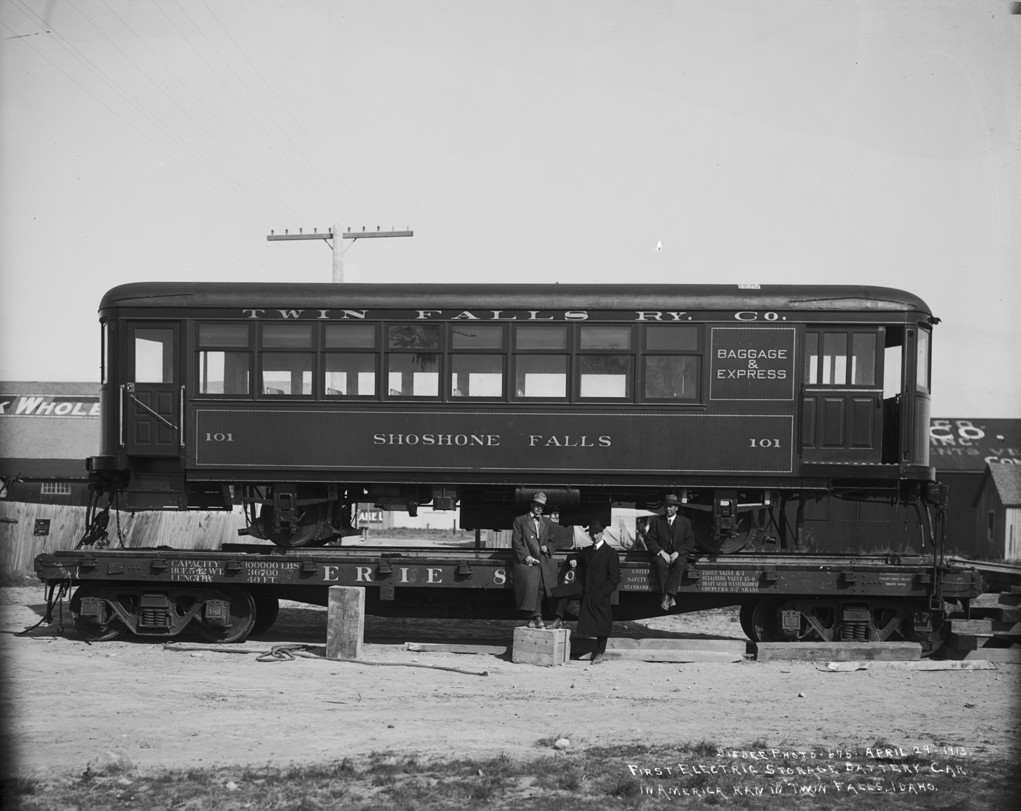 - "April 29, 1913. First Electric Storage Battery Car in America Ran in Twin Falls, Idaho;" three men pose with the railroad car on its Erie flatbed (sign on car says, "Twin Falls Railway Company, Shoshone Falls, Baggage and Express")