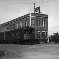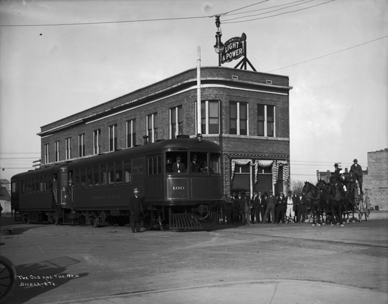 "The Old and the New;" electric storage battery railroad car parked in front of the Power and Light building with people in, on and near the car. Stagecoach and team of horses on right
