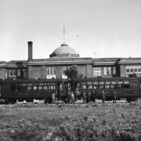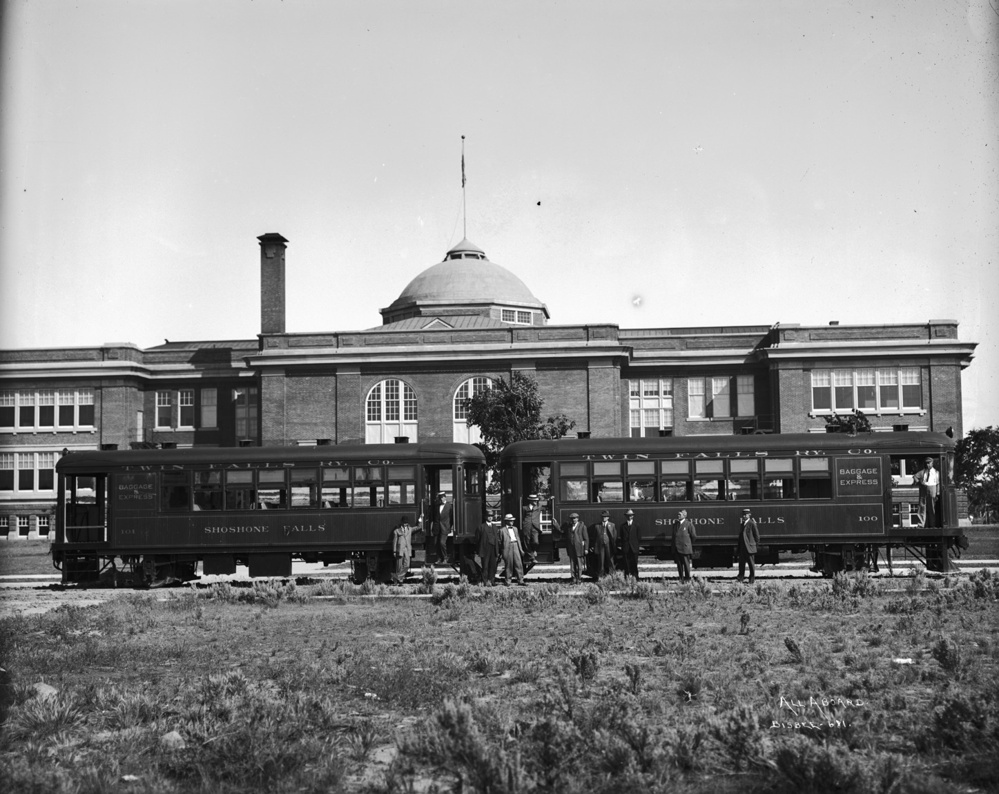 - "All Aboard;" the two cars of the Twin Falls Electric Railway, parked behind the Twin Falls High School, with several men posing with the train.
