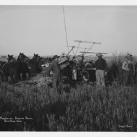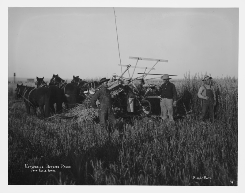 - "Harvesting. Burgess Ranch. Twin Falls, Idaho;" Three men posed beside a four-horse team and a reaper-binder in a grain field.