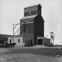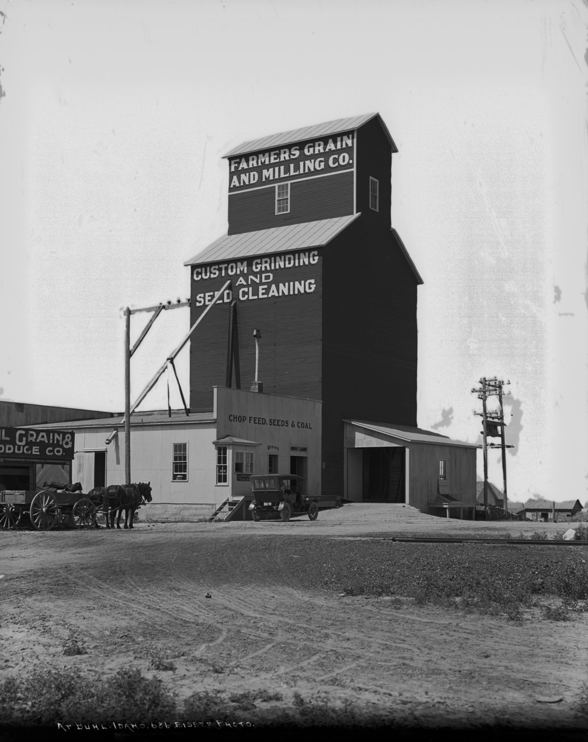 - "At Buhl, Idaho;" Farmers Grain & Milling Company building; Signs read, "Custom Grinding and Seed Cleaning," "Chop Feed, Seeds and Coal;" an automobile and a horse-drawn wagon standing before a large, frame grain elevator and outbuildings