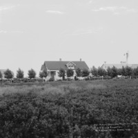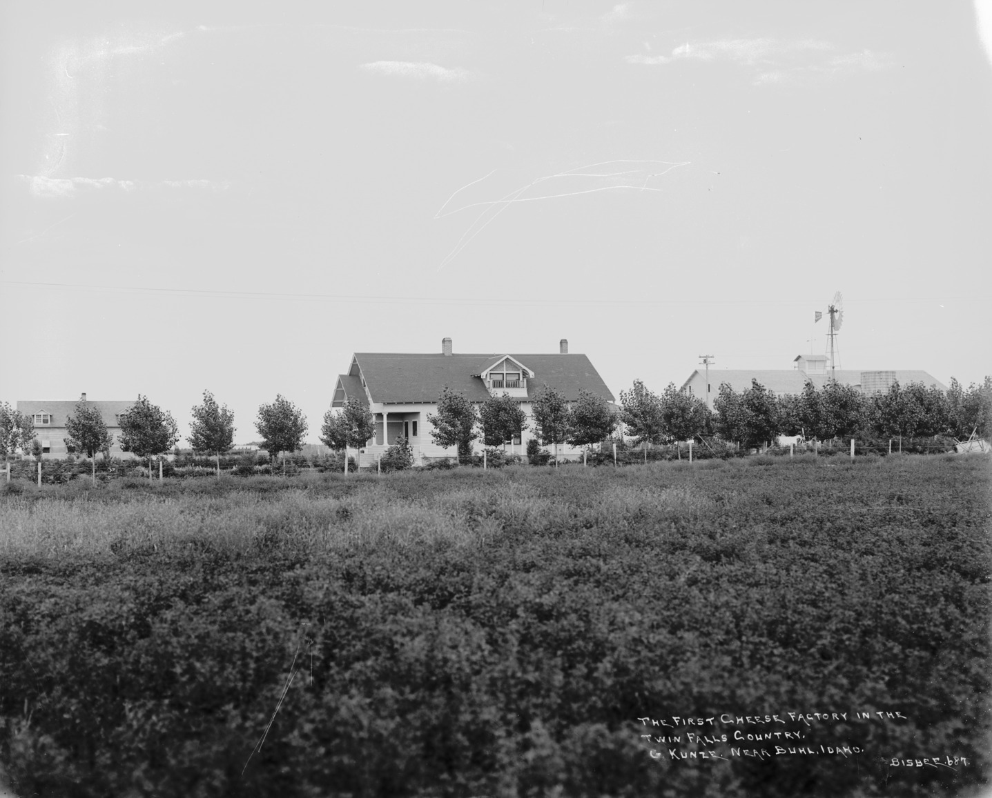 - "The First Cheese Factory in the Twin Falls Country, G. Kunze, near Buhl, Idaho;" House and large outbuildings behind new trees; windmill also visible