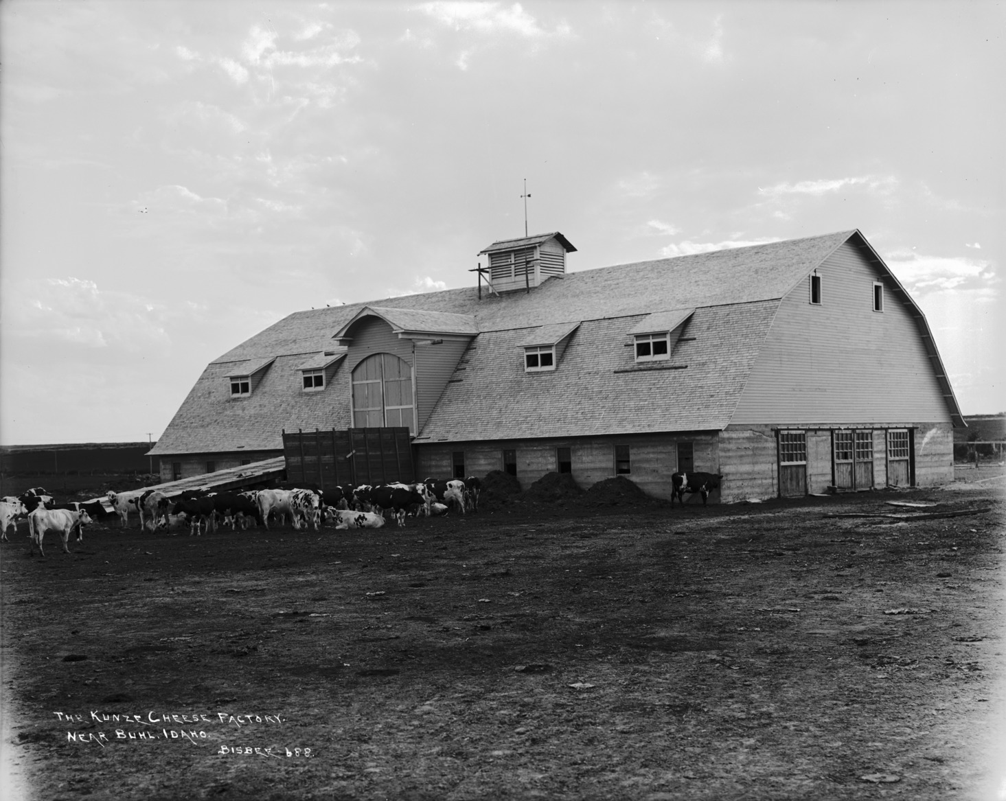 - "The Kunze Cheese Factory, near Buhl, Idaho;" cows outside a barn