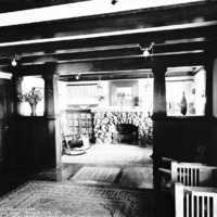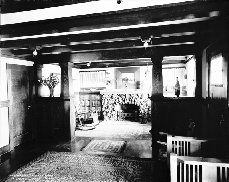 - "W.H. Harvey Country Home Near Buhl, Idaho;" interior view of house; with rock fireplace and seating