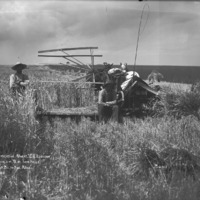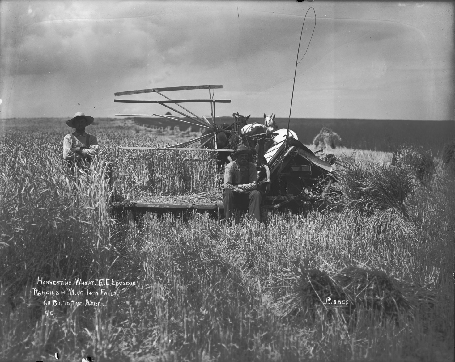 - "Harvesting Wheat. E.E. Logsdon Ranch, 3 Miles West of Twin Falls, Idaho. 60 bushels to the acre;" Two men operating a three-horse team and reaper in a wheat field.