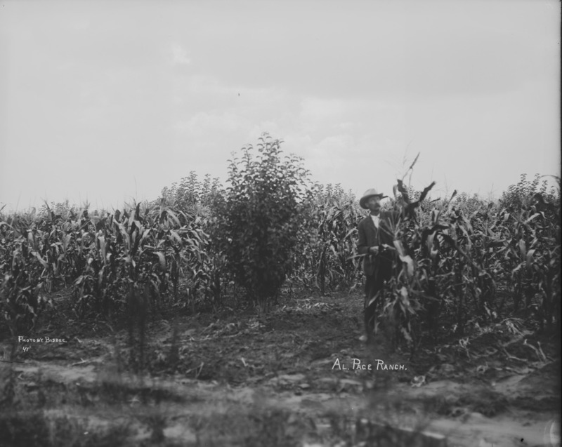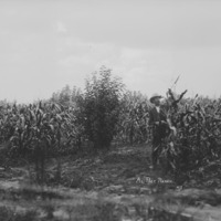 - "Al Page Ranch;" Man standing in a corn field, near a fruit tree.
