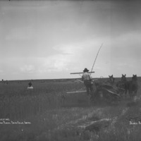 - "Harvesting.Yochem Ranch,Twin Falls, Idaho;" Man with a three-horse team, harvesting a grain field with a reaper-binder. Man or boy stainding in grain field.