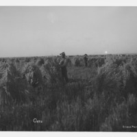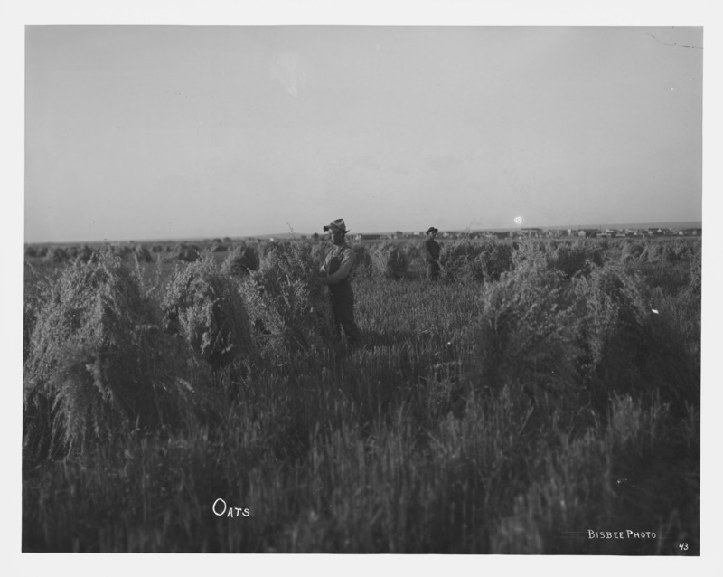 - "Oats;" Two men stacking sheaves of oats in a field on the Twin Falls Tract. Town in background.