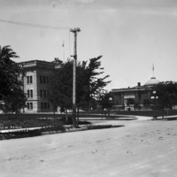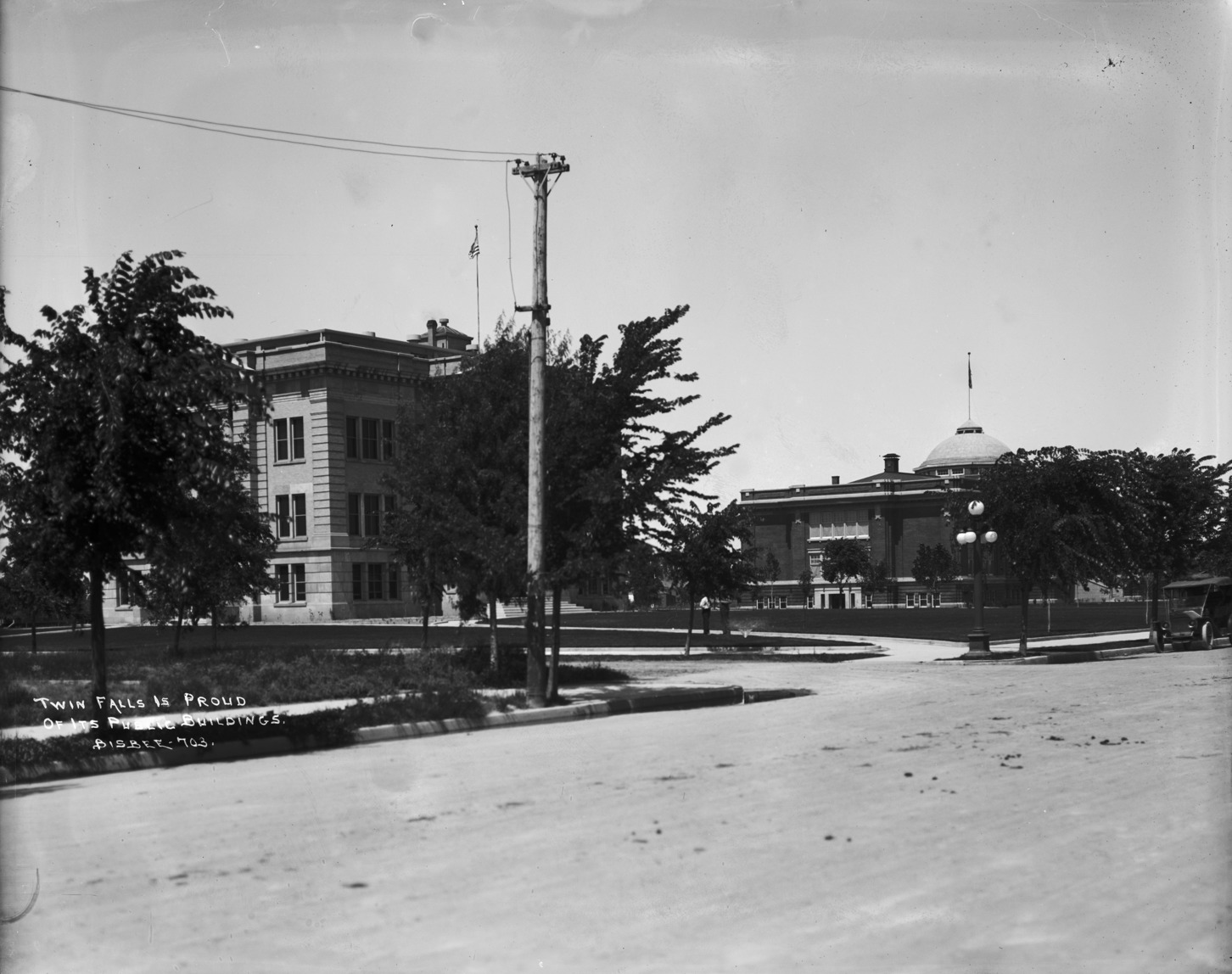 - "Twin Falls Is Proud of Its Public Buildings;" view from Shoshone Street, of the Twin Falls County Court House and Twin Falls High School.