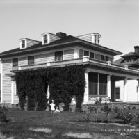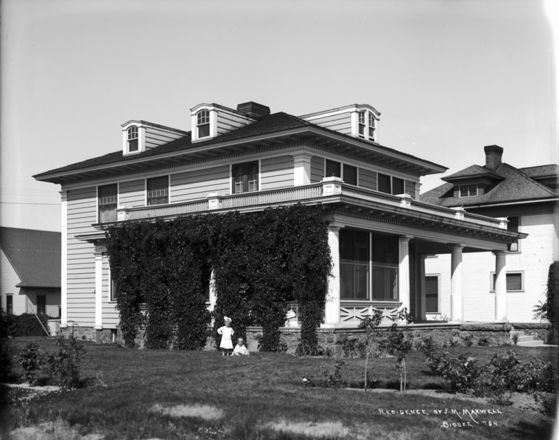 - "Residence of J.M. Maxwell;" two children posing at the ivy-covered side of a house; parts of other houses also visible