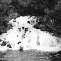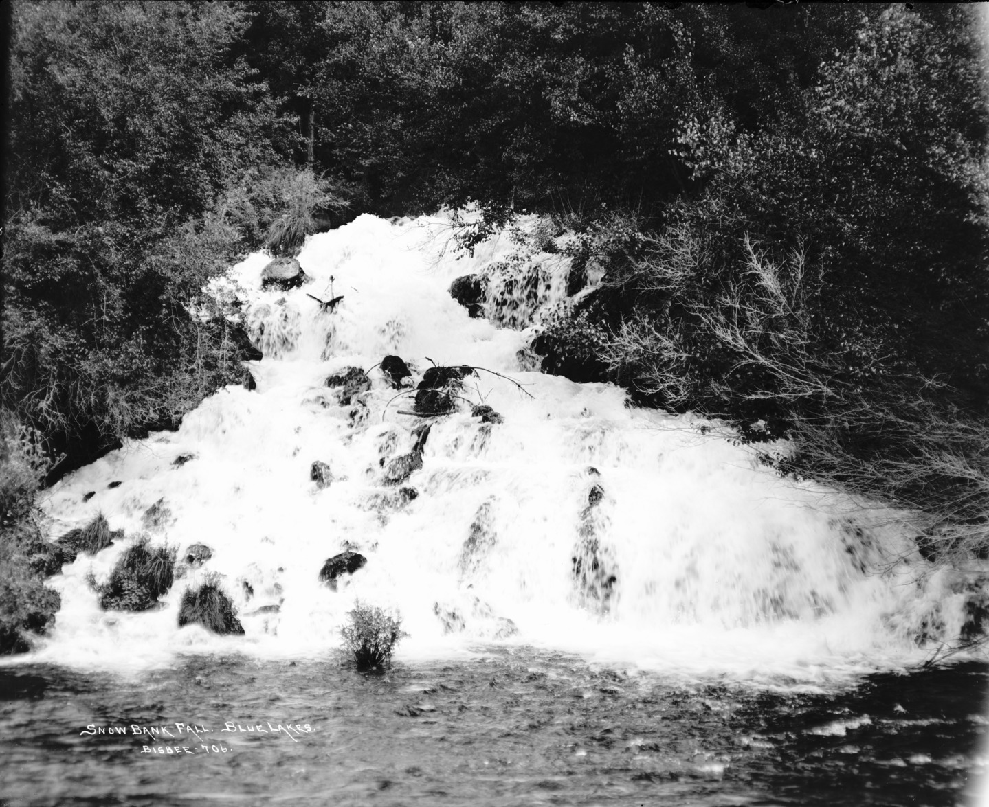 - "Snow Bank Falls. Blue Lakes;" small waterfall