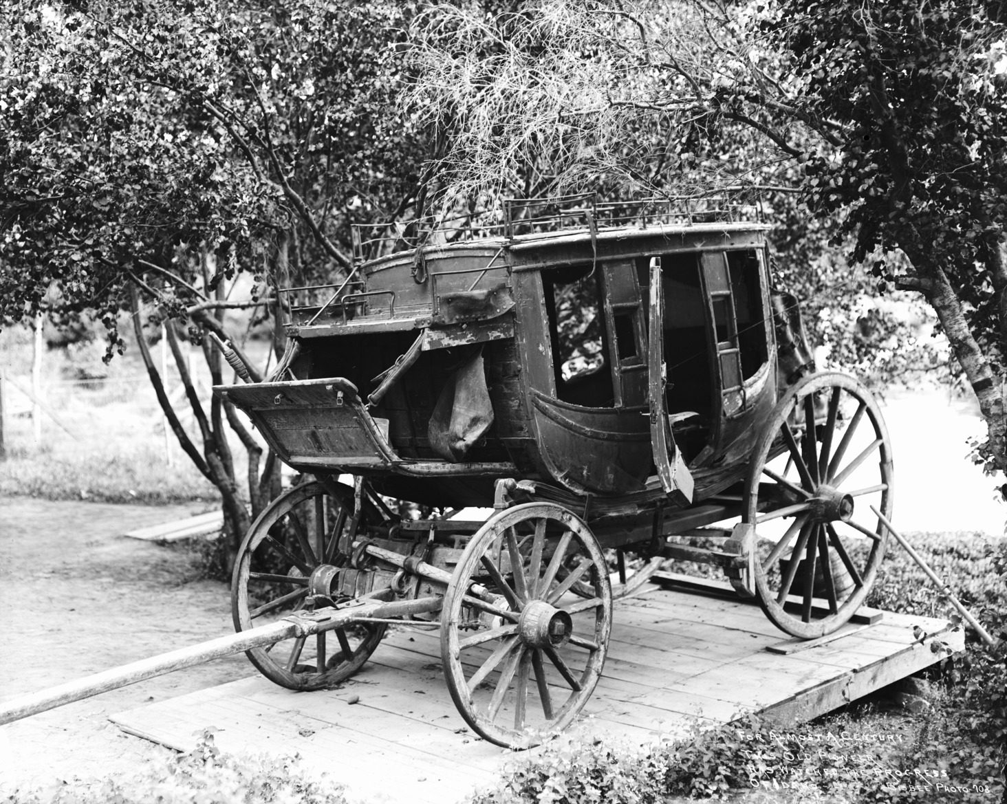 - "For Almost A Century This Old Pioneer Has Watched The Progress of Idaho;" stagecoach fastened to a wooden platform among trees.