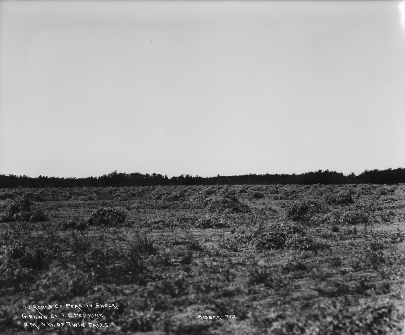 - "40 Acres of Peas in Shock. Grown by I.B. Perrine. Two Miles Northwest of Twin Falls;" field of peas