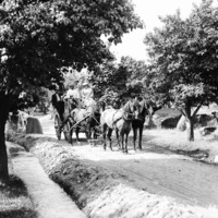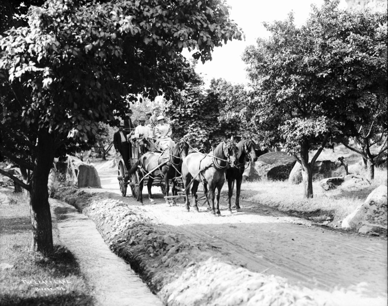 - "The Leafy Lane;" stagecoach with passengers and horses on a road through a grove of large trees.