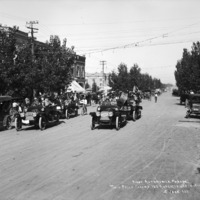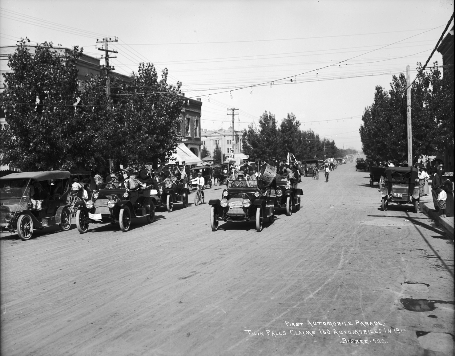 - "First Automobile Parade. Twin Falls Claims 160 Automobiles in 1913;" parade on Shoshone Street, Twin Falls County Court House in background; automobiles carrying band and musical instruments have signs with "Member of Twin Falls Commercial Club;