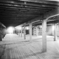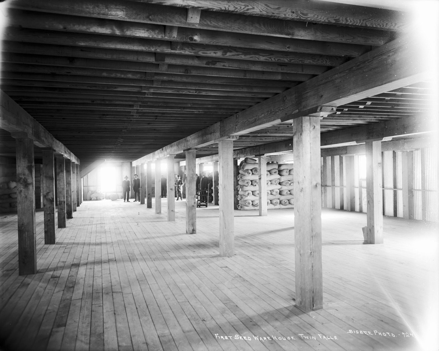 - "First Seed Warehouse. Twin Falls;" Interior of a large room with support pillars; men standing at the far end with piles of bags.