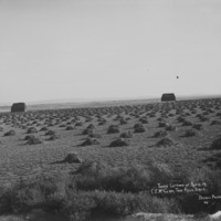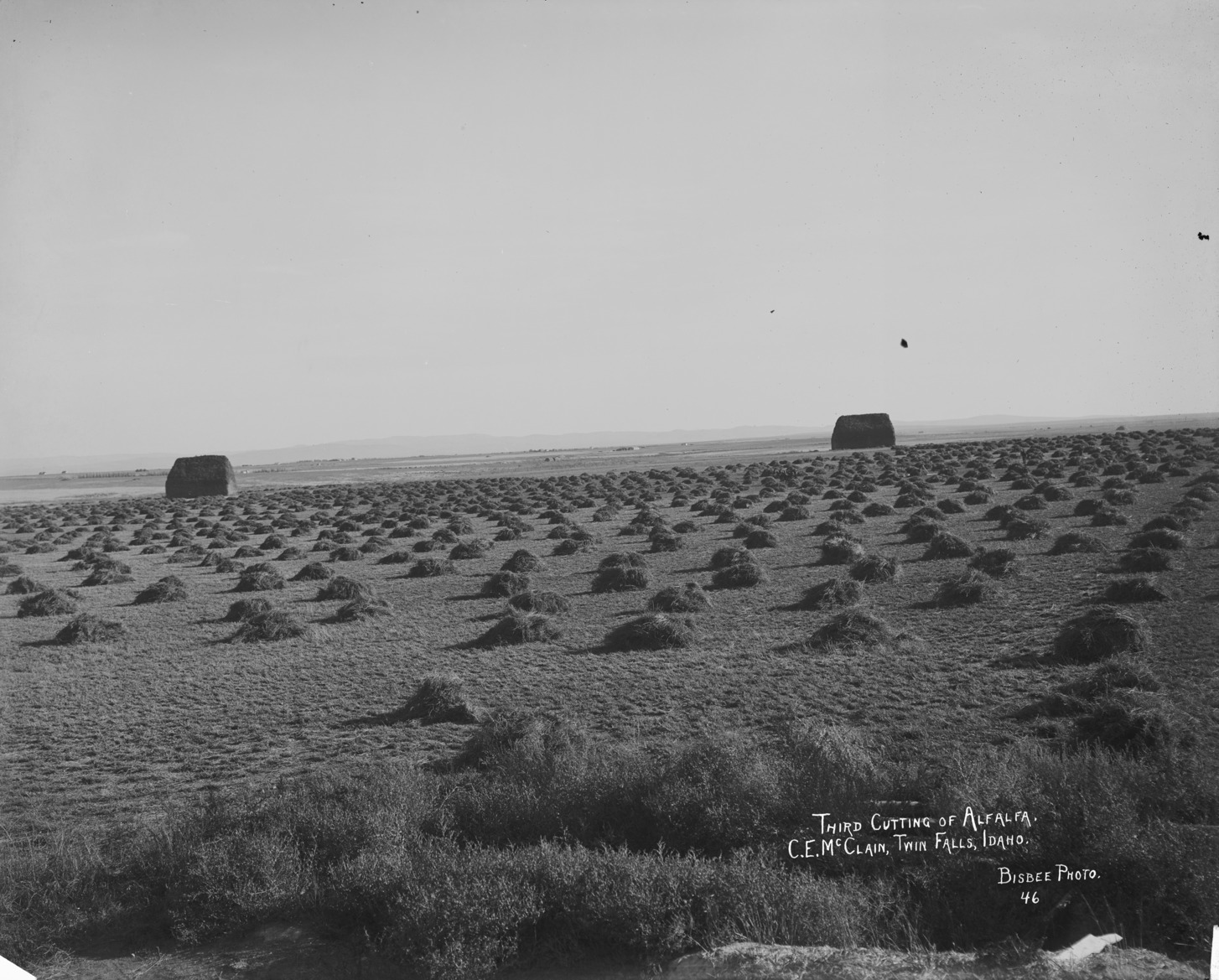 - "Third cutting of alfalfa. C.E. McClain, Twin Falls, Idaho;" field with small piles of alfalfa. Two large stacks of hay/alfalfa in the background.