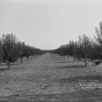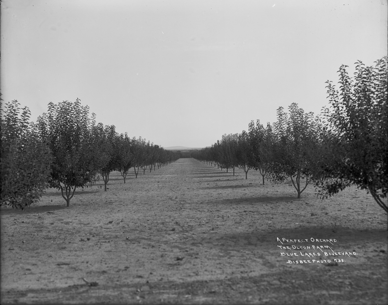 - "A Perfect Orchard. The Olson Farm. Blue Lakes Boulevard;" view down the middle of two long rows of fruit trees.