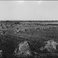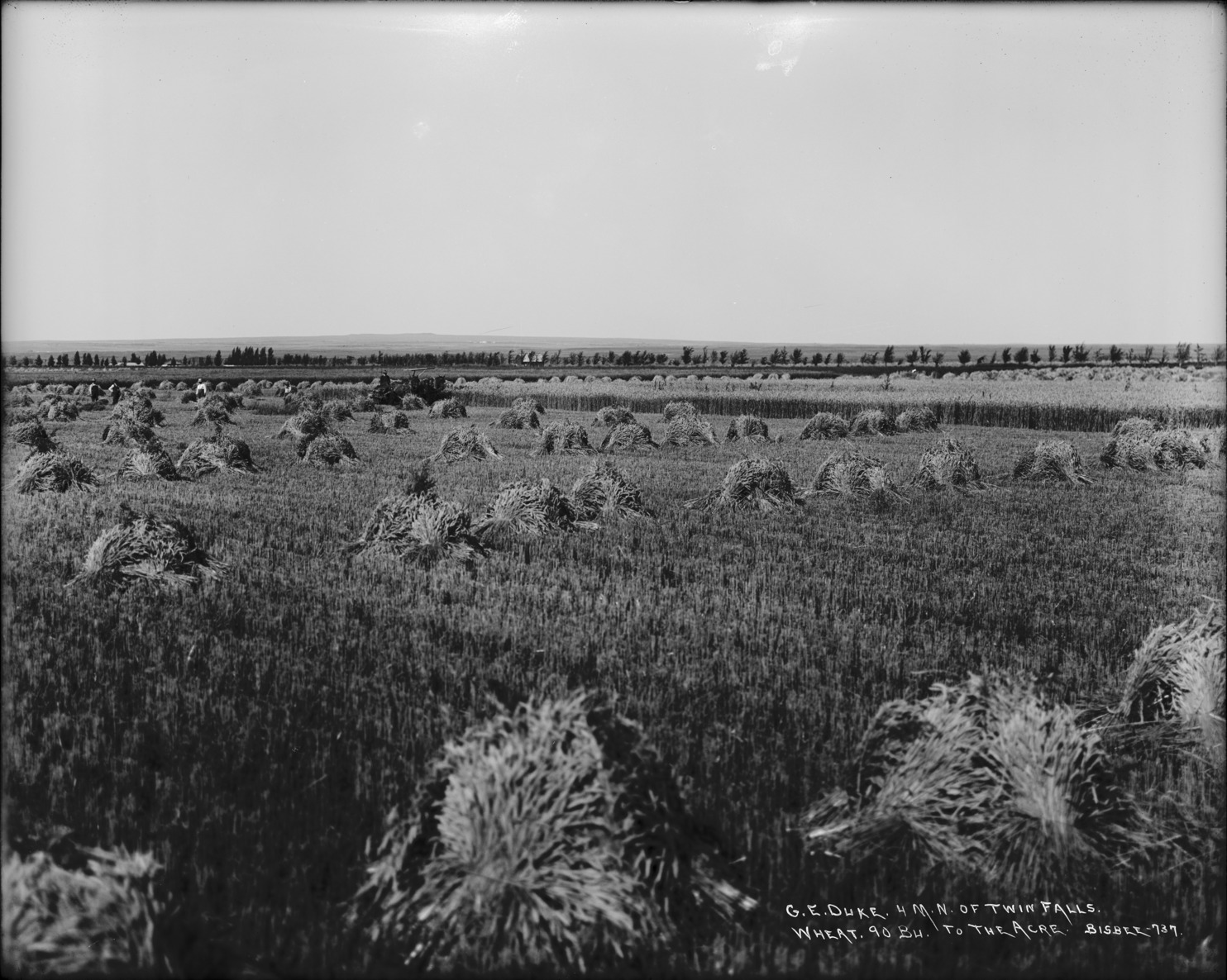 - "G.E. Duke. 4 Miles North of Twin Falls. Wheat. 90 Bushels to the Acre;" field of shocked wheat in the foreground; men and a team of horse with binder in background