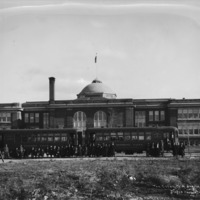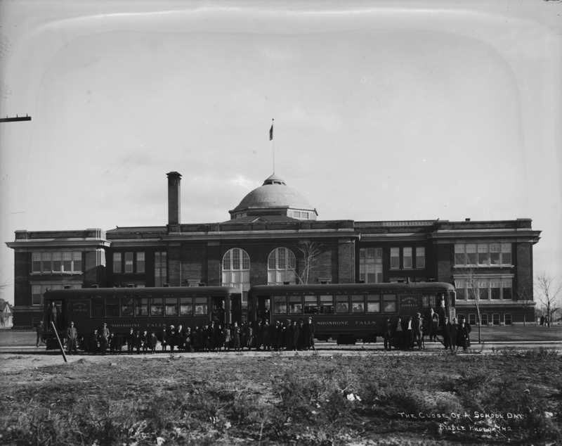 - "The Close of a School Day;" Twin Falls Electric Railway cars behind Twin Falls High School; passengers can be seen sitting in the cars, and several people, including children, pose in front of the cars.