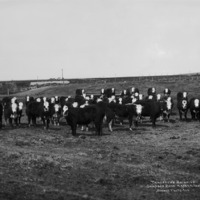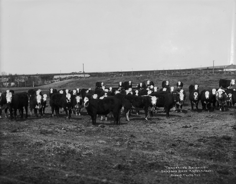 - "Tomorrow's Shipping. Sampson Brothers. Hansen, Idaho;" cows in a field, buildings and utility poles in background