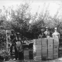 - "Eight Year Old Apple Tree. L.A. Snyder Orchard;" five men, dressed in overalls and standing in front of fruit trees, with several boxes of apples, a table, and a ladder
