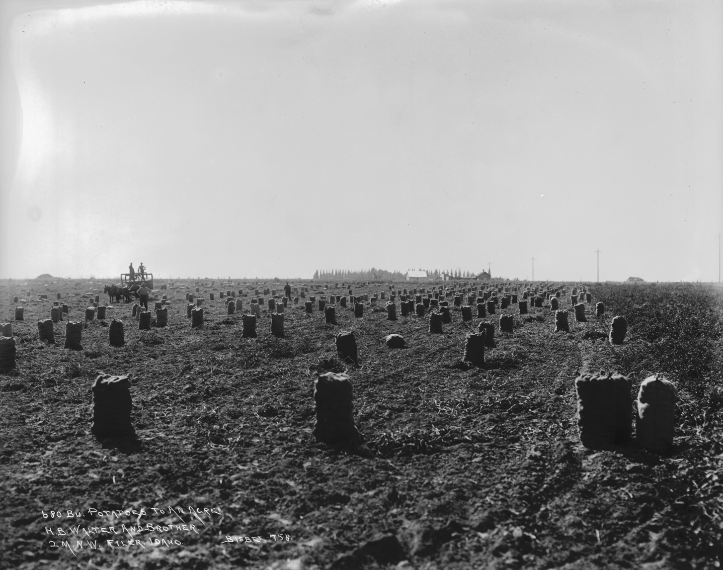 - "680 Bushels Potatoes to an Acre. H.B. Walter and Brother. Two Miles Northwest of Filer, Idaho;" a field of bagged potatoes; men and a team of horses and wagon on left.