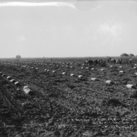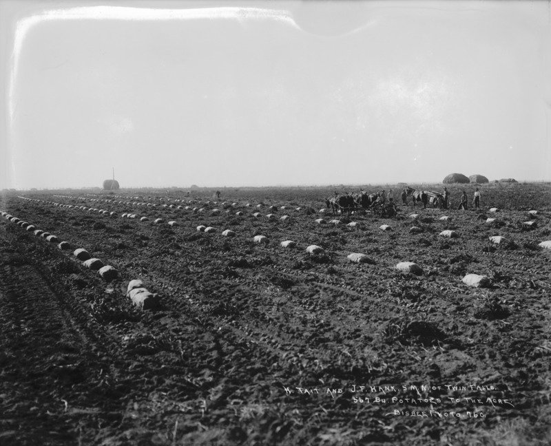 - "H. Tait and J.F. Hank. 5 Miles North of Twin Falls. 567 Bushels Potatoes to the Acre;" a field of bagged potatoes; several men, horses, and farm implements on right; haystacks in background