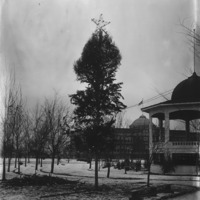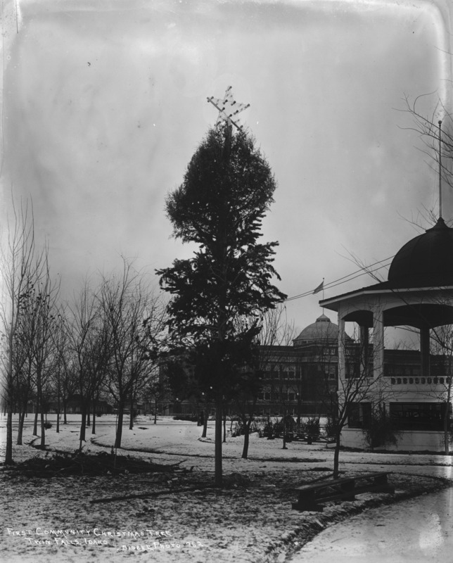 - "First Community Christmas Tree, Twin Falls, Idaho;" evergreen tree topped by a star in City Park near band stand (gazebo); Twin Falls High School in background