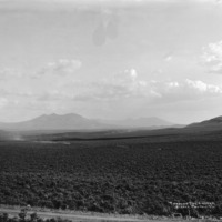 - "Through the Desert;" line of automobiles on a dirt road through an area of sagebrush