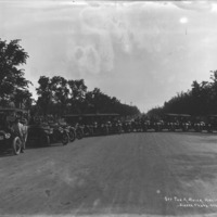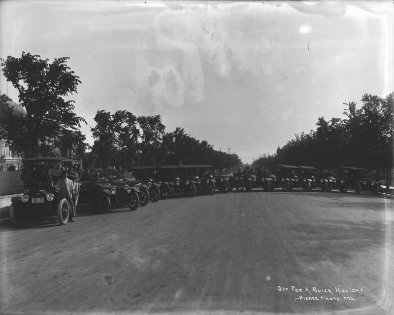 - "Off for a Buick Holiday;" line of Buick automobiles parked across Shoshone Street; trees line the street; Twin Falls High School on left