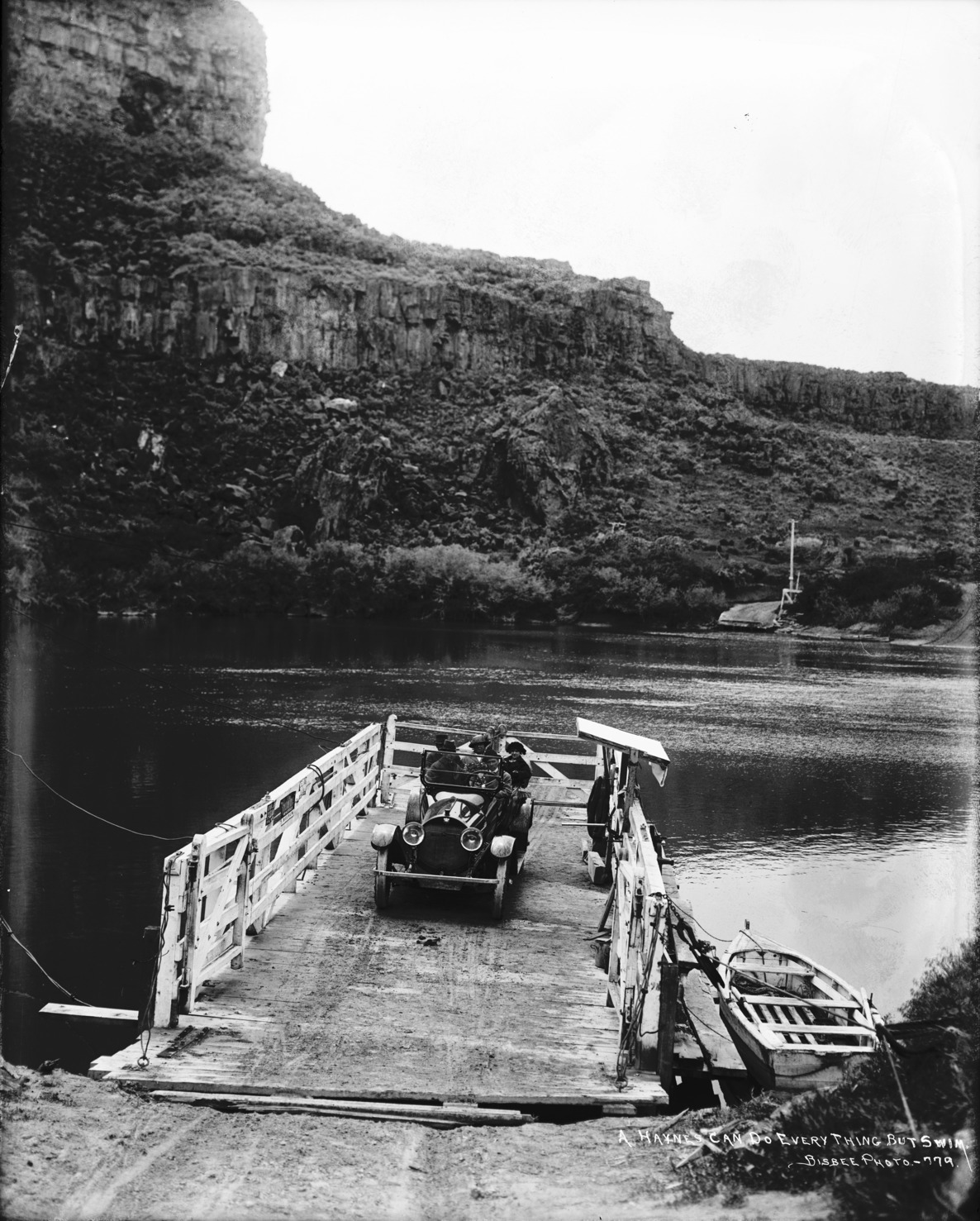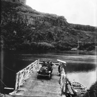 - "A Haynes Can Do Everything But Swim;" automobile with people on the ferry at Shoshone Falls.