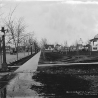 - "Showing Cluster Lighting System. Twin Falls, Idaho;" view of City Park along Shoshone St, light fixtures, band stand (gazebo). Houses along 6th Ave E, 6th Ave N, and Shoshone St are visible in background
