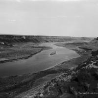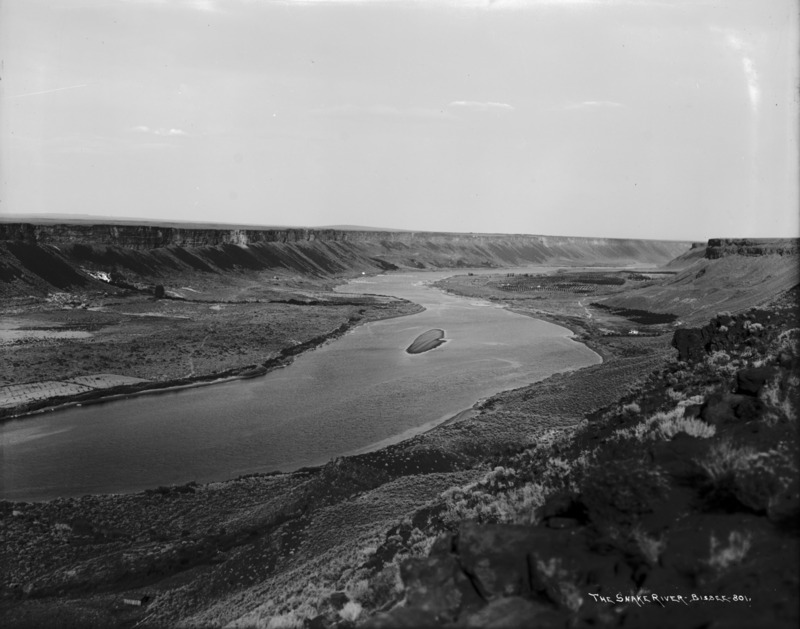 - "The Snake River;" view from canyon rim, with farms and orchards visible along the river.