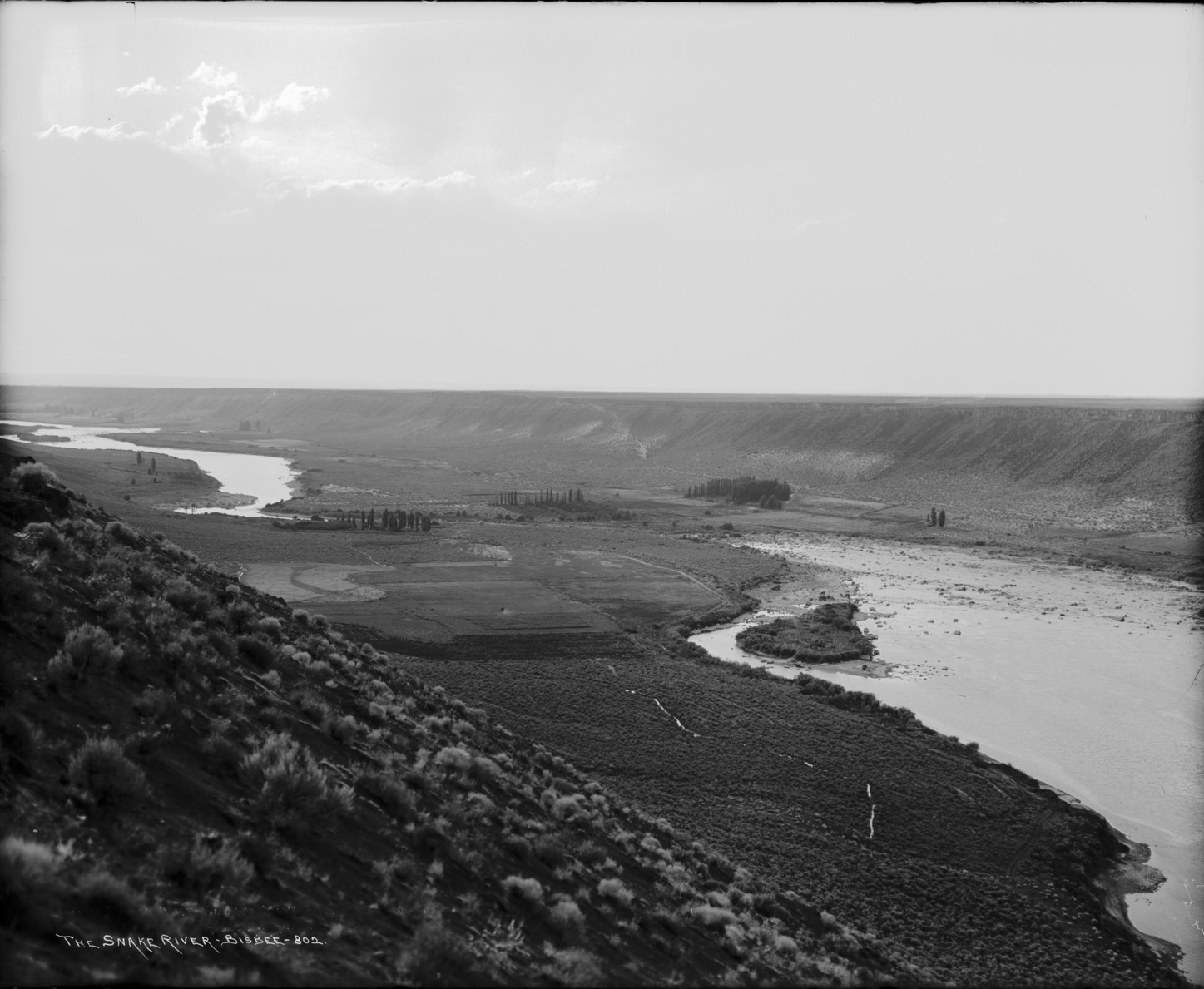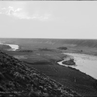 - "The Snake River;" view from canyon rim, looking on farms located along the river.