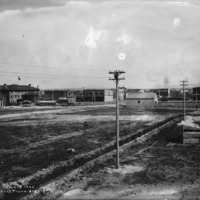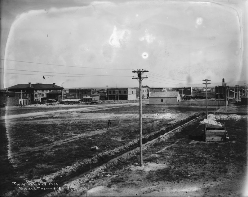 - "Twin Falls in 1906;" A man in a vacant field, with beginnings of the townsite in the background. Visible: Hotel Perrine (back view); Bickel School in background; Furniture; Hardware, water tower