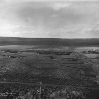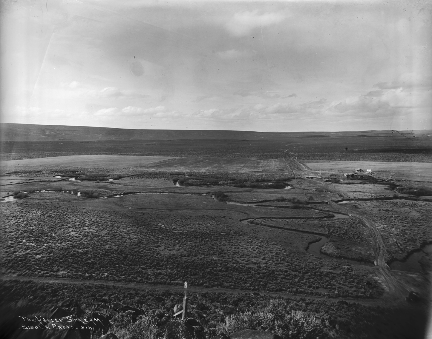 - "The Valley Stream;" log building, outbuildings, and tent with fenced property beside a stream; man behind post in foreground