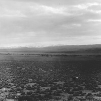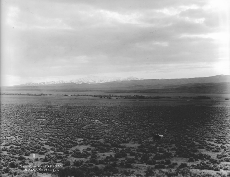 - "The Great Expanse;" two horses and a wagon among the sagebrush desert in the foreground; stream and trees in the middle ground, mountains in the background